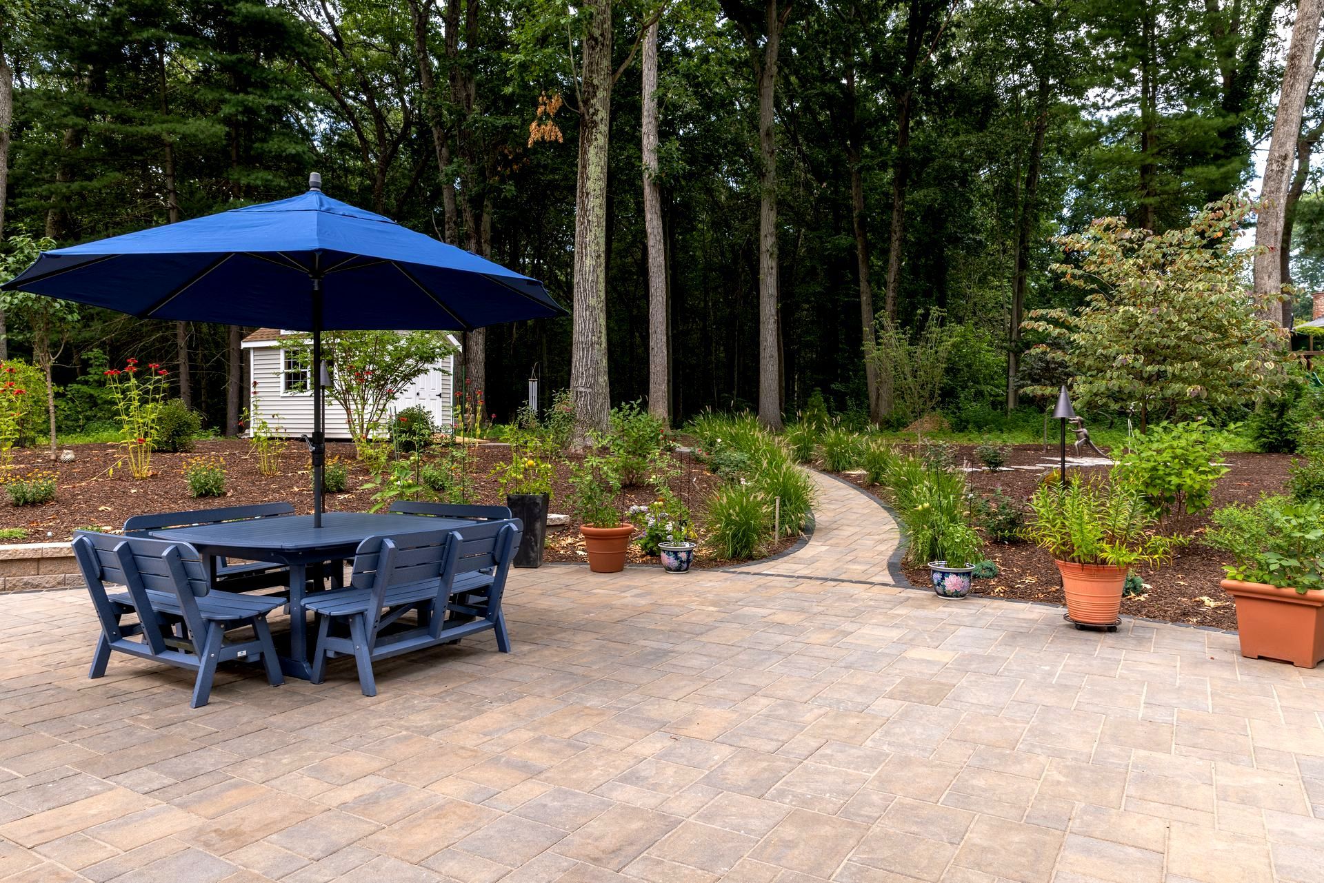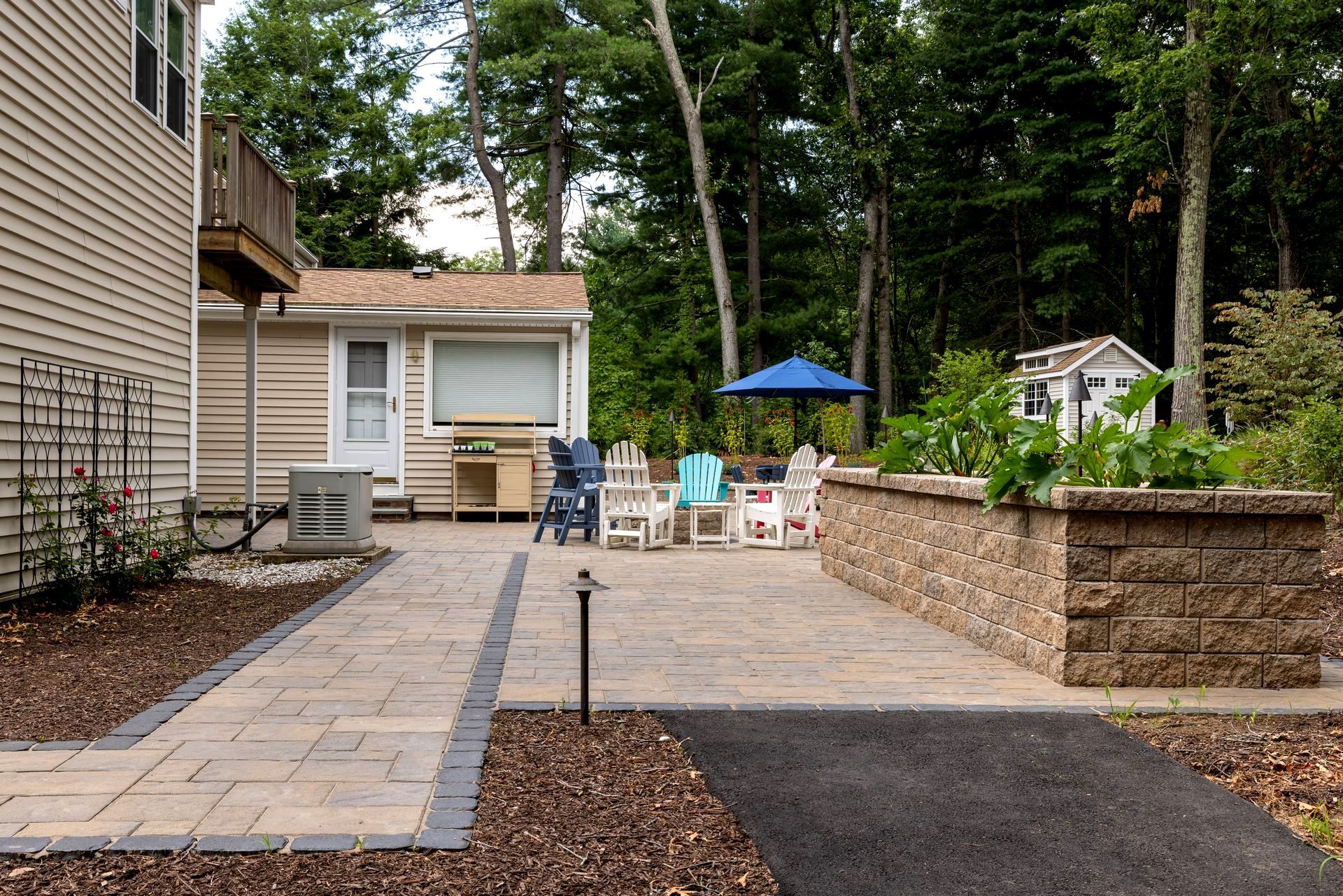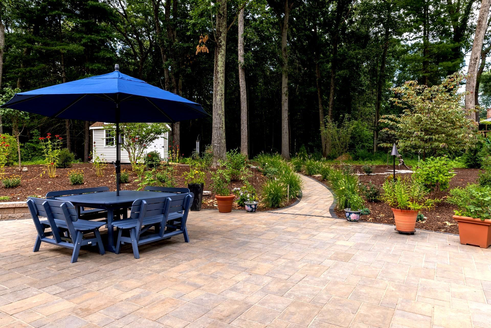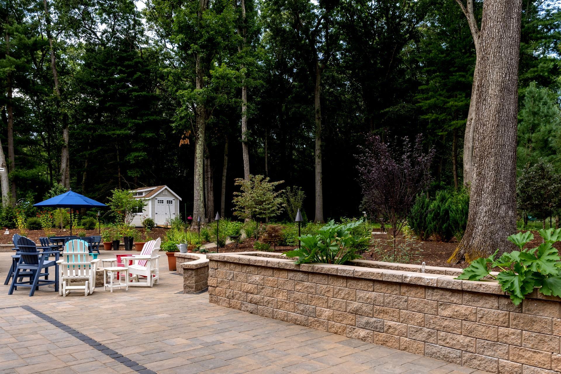 Our client called us as they wanted to replace their existing deck that had been built in the ‘80’s with a stone patio, fire pit and update all of their plantings. Her vision was to create a welcoming park like setting to host their large family gatherings and have designated planting beds for vegetables and herbs.