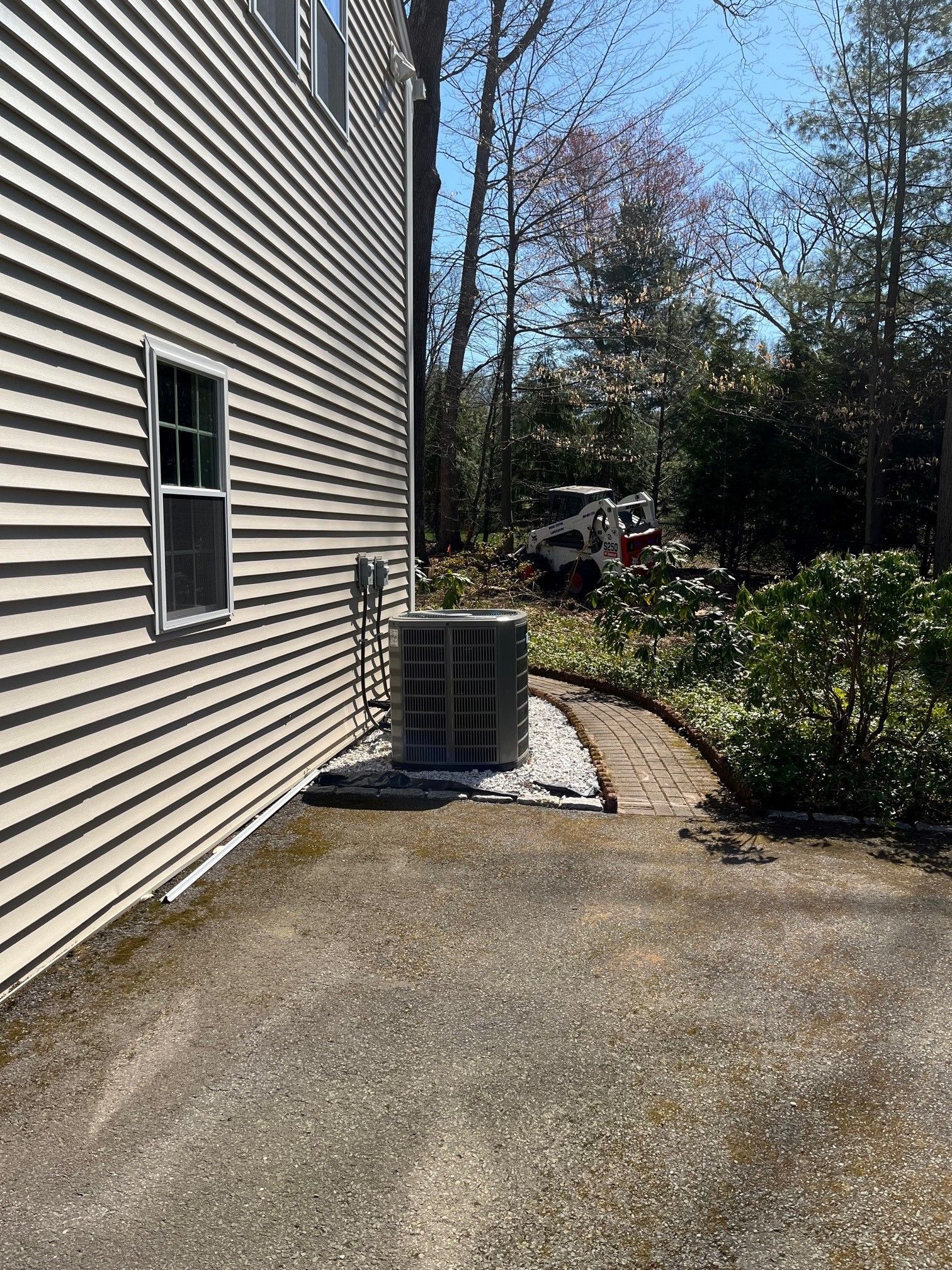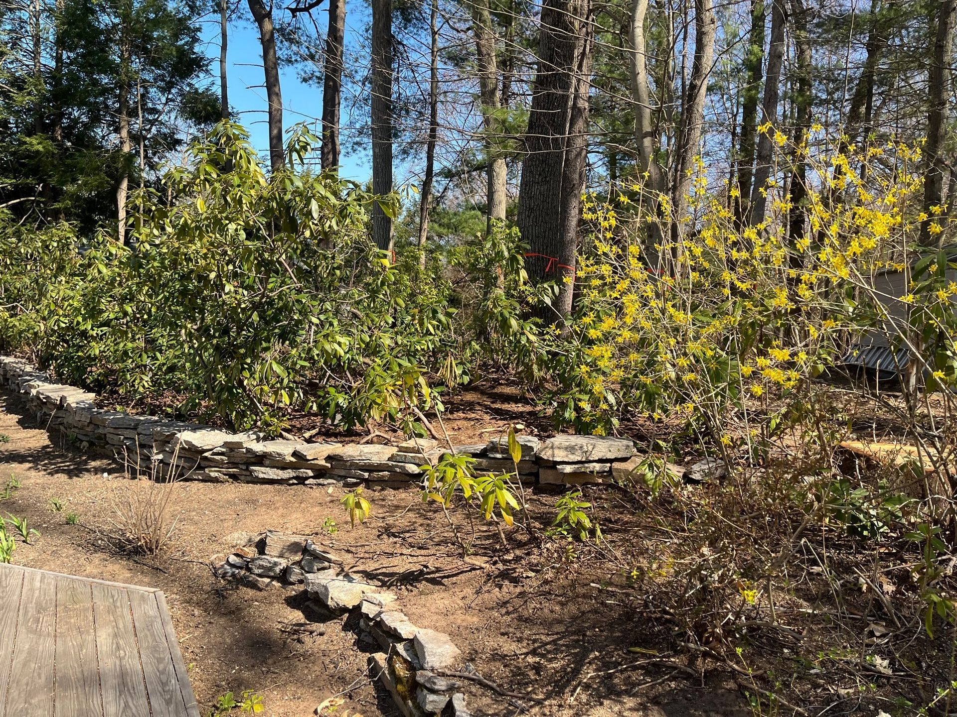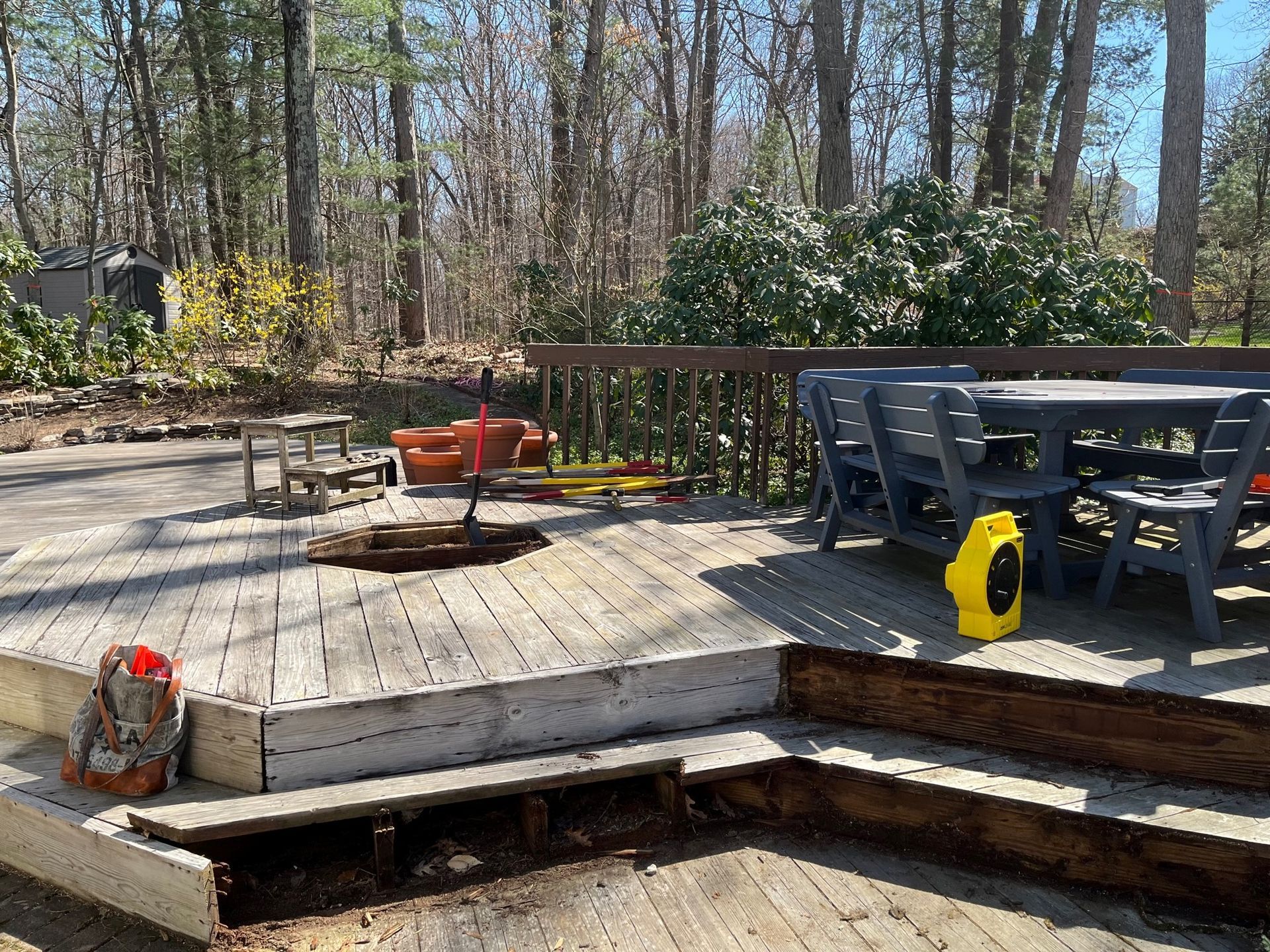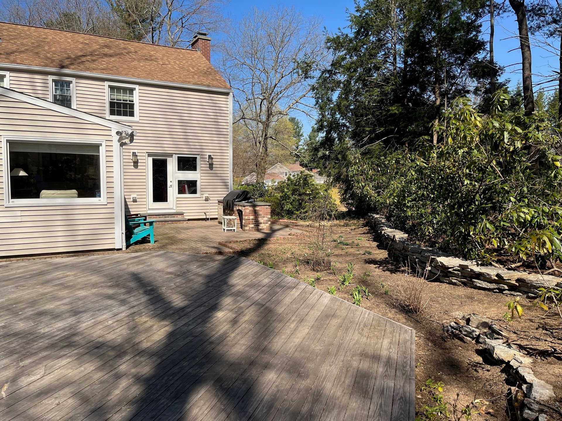 Our client called us as they wanted to replace their existing deck that had been built in the ‘80’s with a stone patio, fire pit and update all of their plantings. Her vision was to create a welcoming park like setting to host their large family gatherings and have designated planting beds for vegetables and herbs.