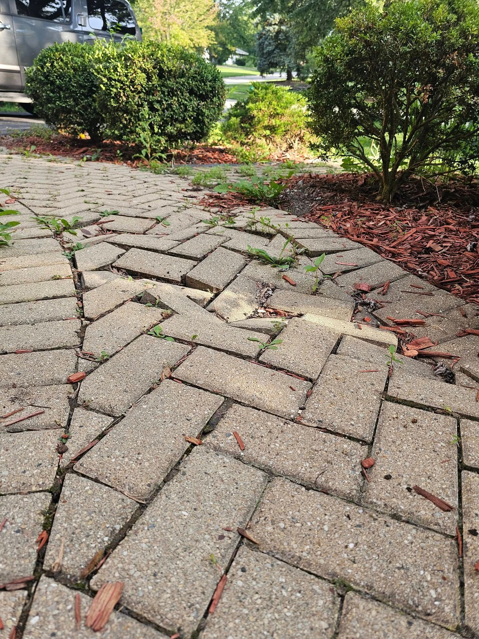 Missing sand or mortar between pavers allows movement and weed growth.