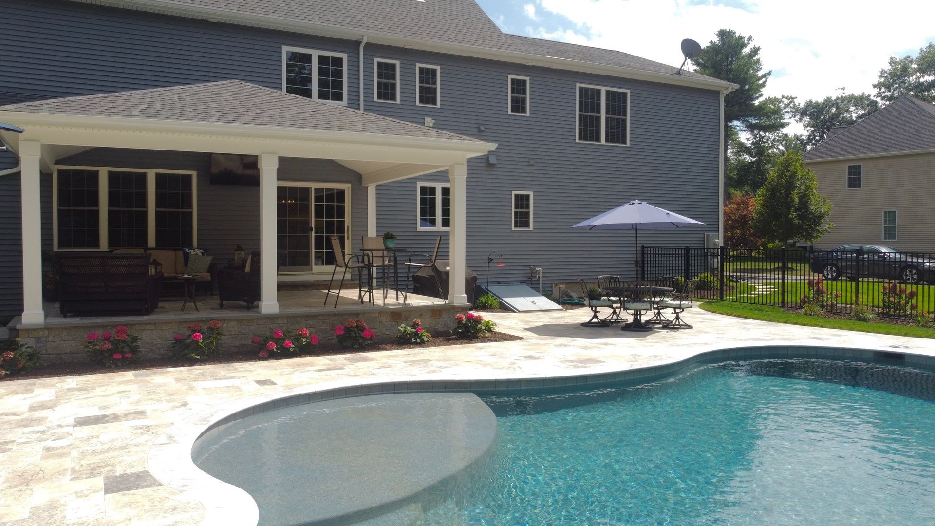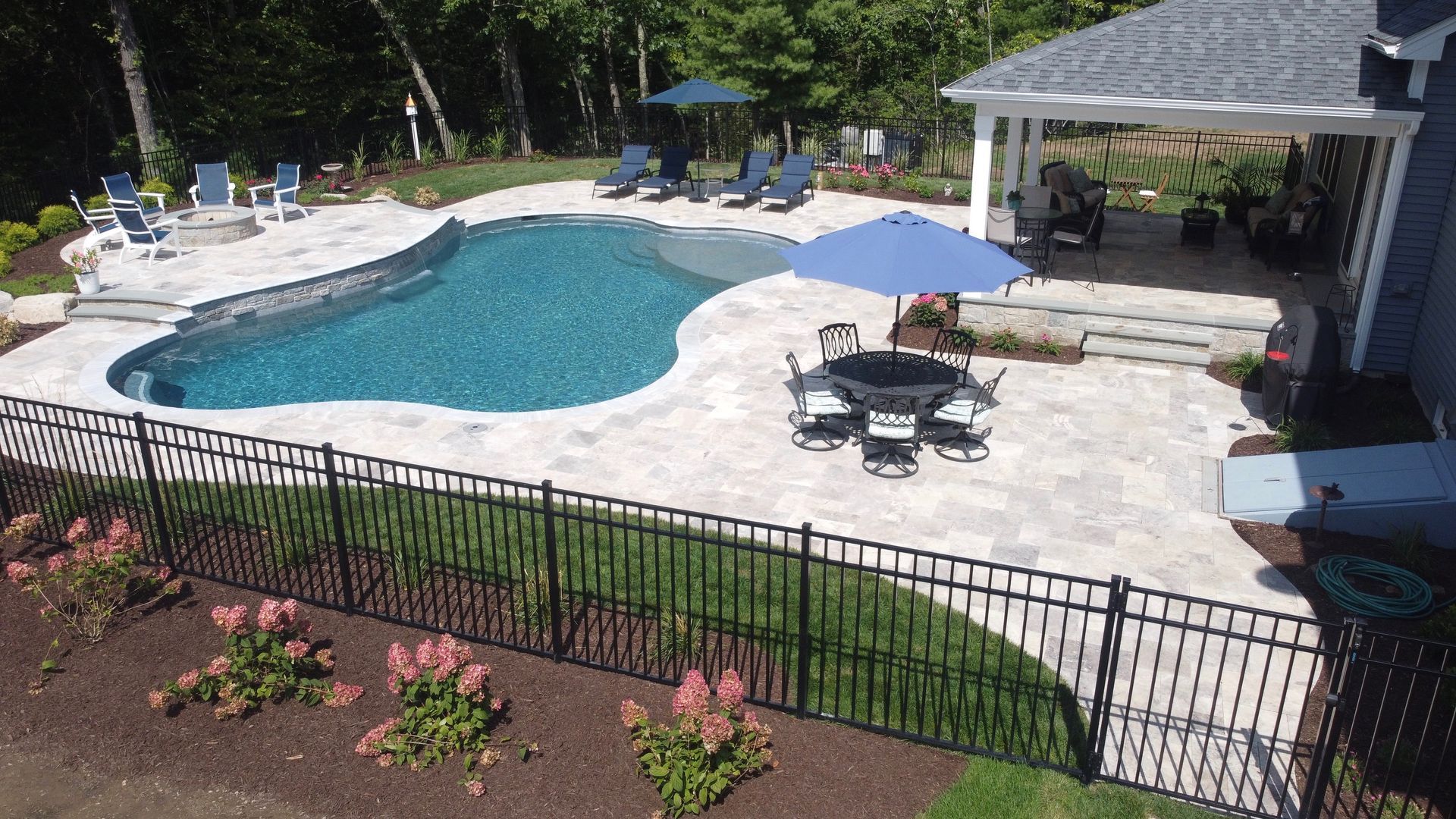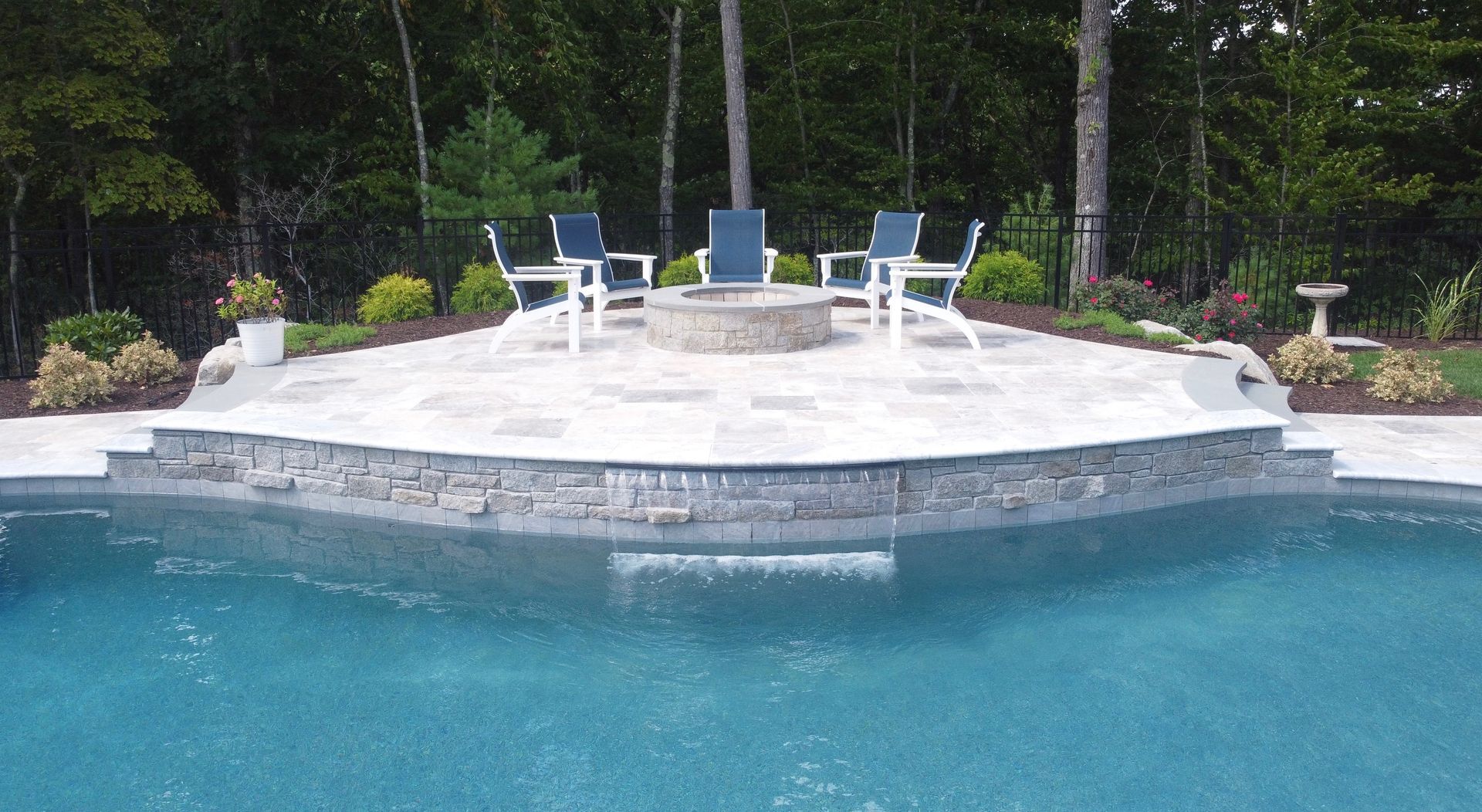 The focal point of course was the pool. The family had recently lived in the south and loved their raised patio porch – we recommended redesigning the existing deck to simulate a porch similar to what they had in their previous home. From the vantage point of the porch you can see the entire pool, the raised patio for the fire pit. Silver Travertine pool patio complimented by the Tower Hill natural stone with bluestone accents features on the porch and fire pit creates a stunning backyard!