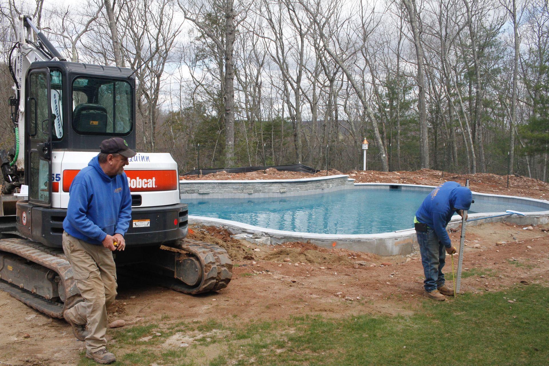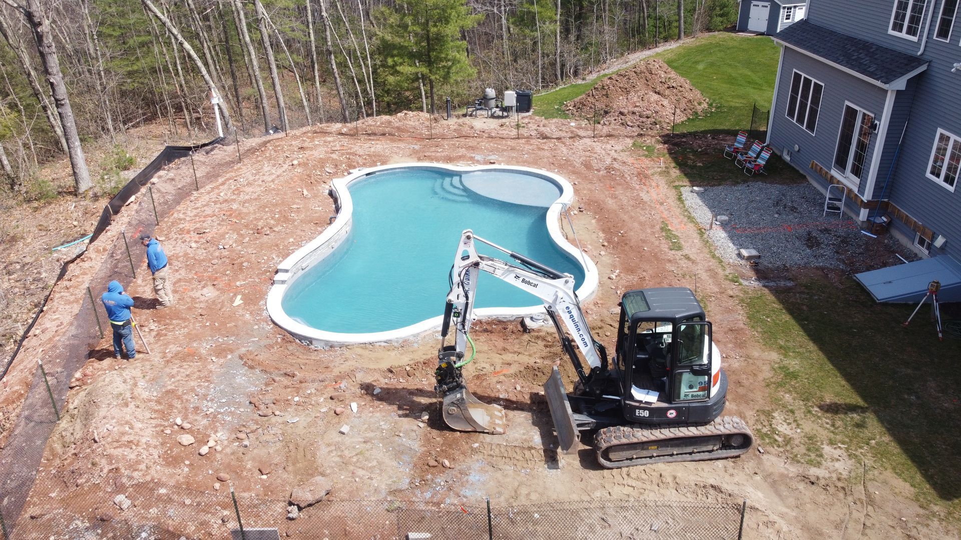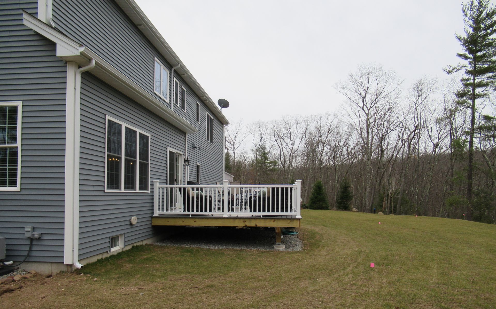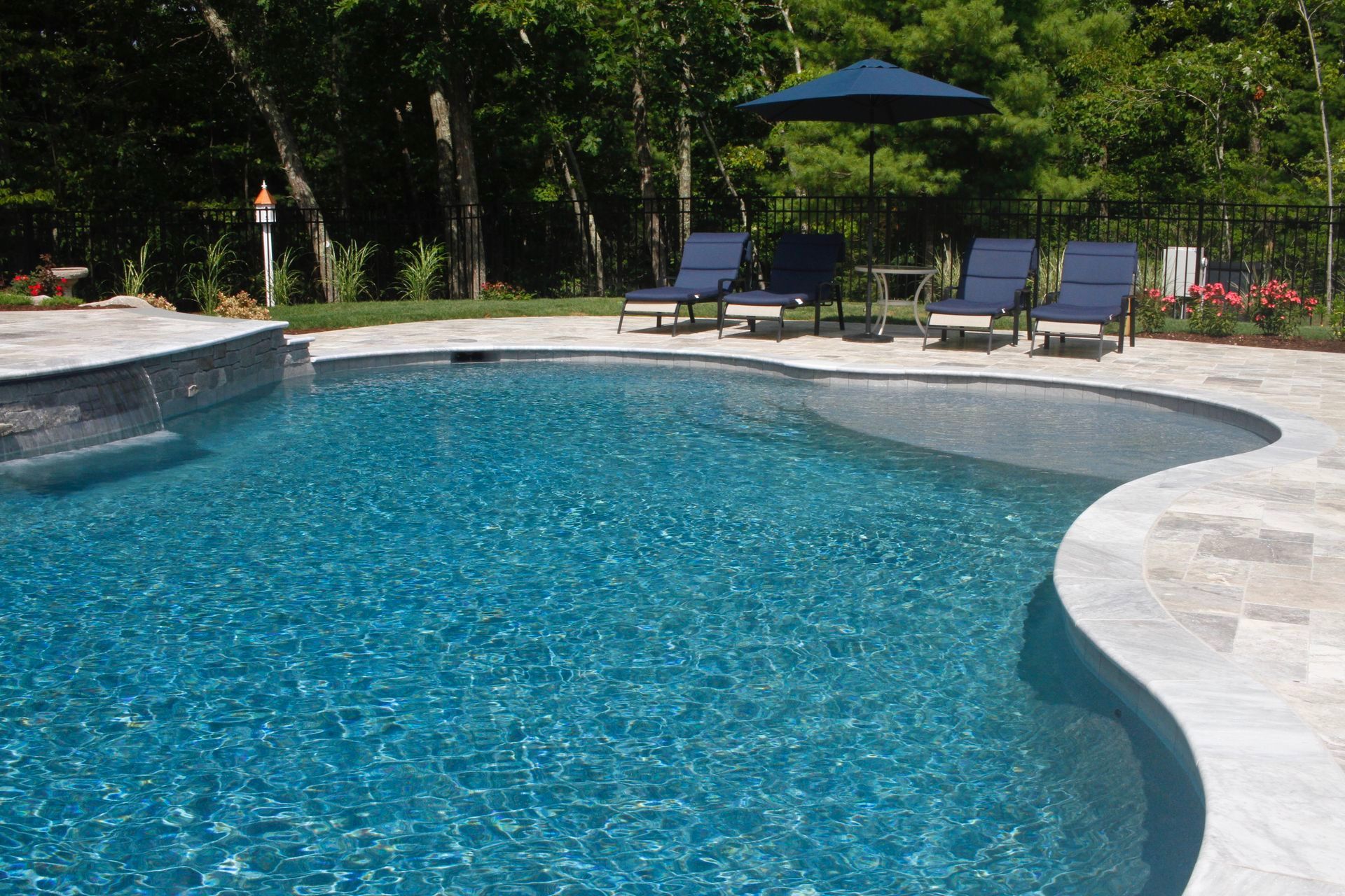 The focal point of course was the pool. The family had recently lived in the south and loved their raised patio porch – we recommended redesigning the existing deck to simulate a porch similar to what they had in their previous home. From the vantage point of the porch you can see the entire pool, the raised patio for the fire pit. Silver Travertine pool patio complimented by the Tower Hill natural stone with bluestone accents features on the porch and fire pit creates a stunning backyard!