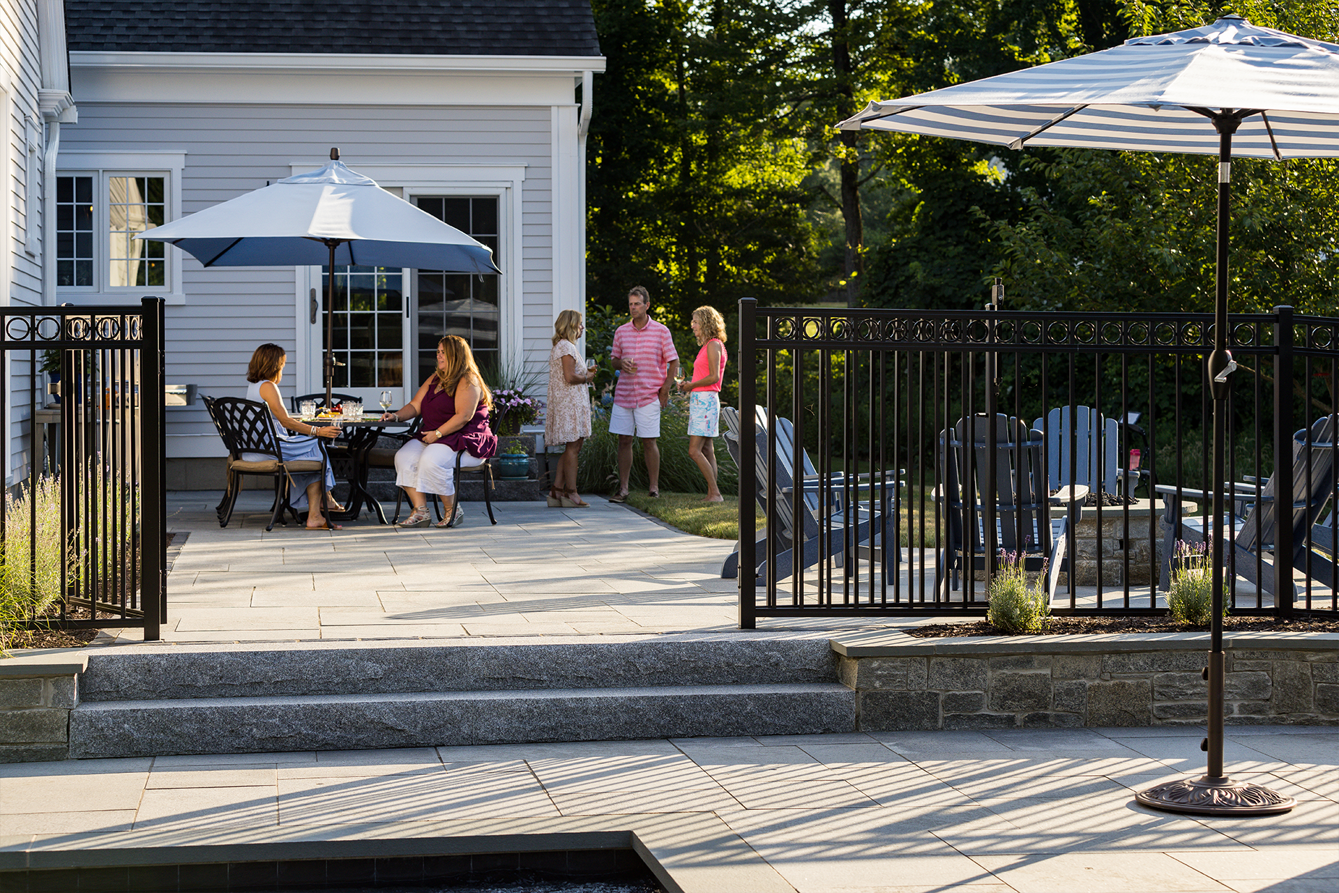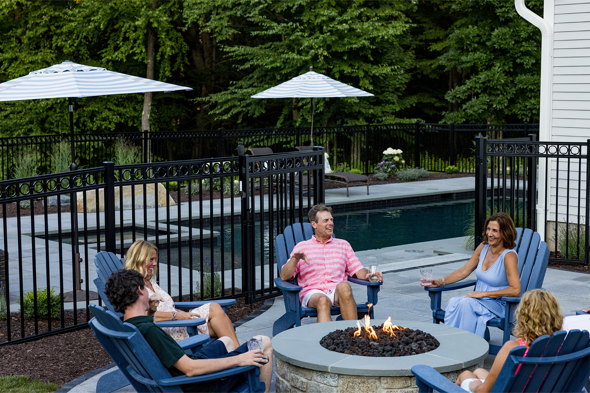 In working through the design process with the homeowners we learned that they liked the location of existing patio for dining and grilling but wanted to enlarge it. A fire pit was used to create another space for gathering but also helped to create flow from the dining area to the pool area. From the fire pit area, you can see the stunning views and the entire pool area.